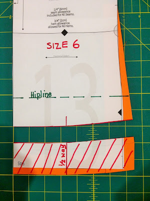 Going back to this image, as shown in orange, join the markings on the hip with the waist notch on the side seam and draw the curve from the hip to the centre front.
