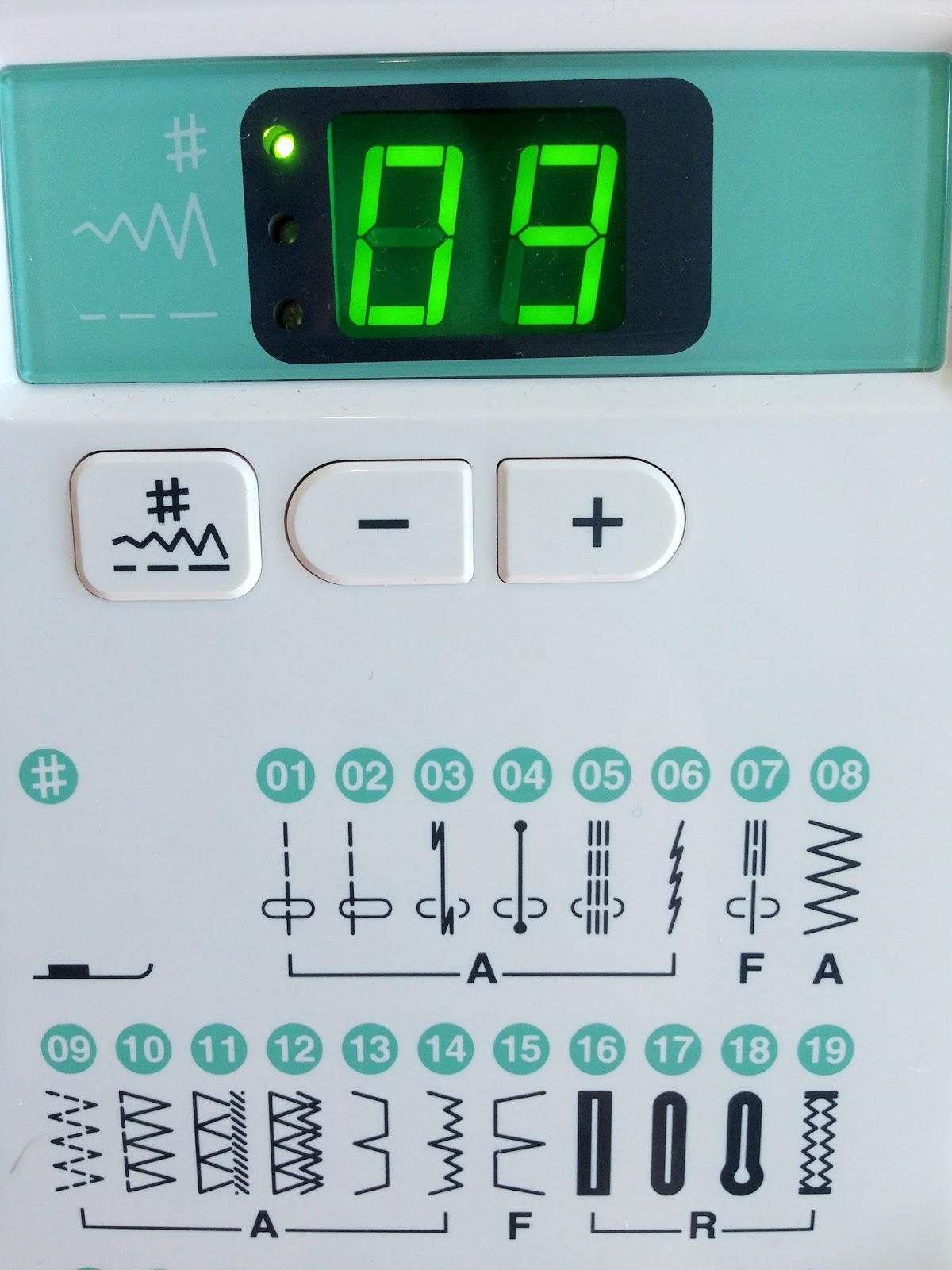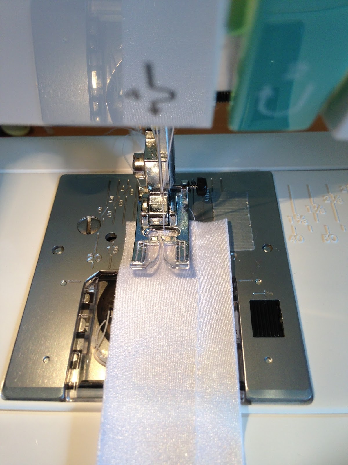 6.  Next, change your machine to a wide zig-zag stitch, or in this case I used a 3 step zig zag.  The reason you will use a zig-zag is because the ruffle is being added onto stretch fabric and if we use a straight stitch it will be more prone to cracking or getting damaged if the area is pulled whilst being worn.