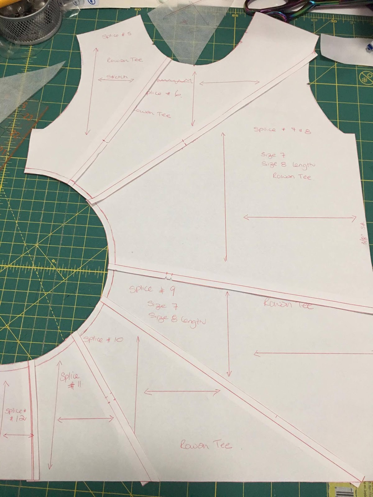 Transfer pattern marks. Fold your new traced piece in half and fold whole Sunshine Tee Template Piece in half to make it easier to line up centre using the crease. Line up traced shirt front pattern on top of spliced pattern. Line up the armsyce so the sun will stay in about the same place.